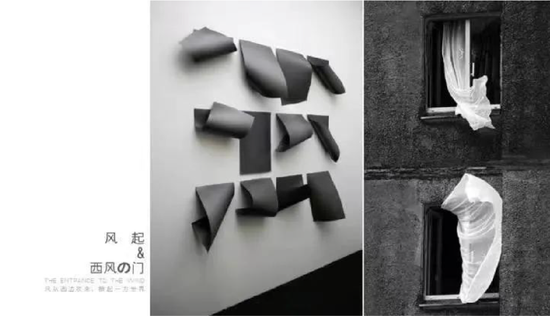 門房設(shè)計以西風(fēng)做為靈感來源。清風(fēng)無痕,如何表現(xiàn)風(fēng)呢?為了將抽象的風(fēng)具象化,風(fēng)吹過后的物體形態(tài)為設(shè)計提供了思路。設(shè)計從卷曲的紙張、飄揚的窗簾中提取出曲線,作為大門的視覺設(shè)計語言,破除了傳統(tǒng)門廳四方、尖銳、厚重的設(shè)計語言,以動寫靜,以柔表剛,具有自由的氣息。