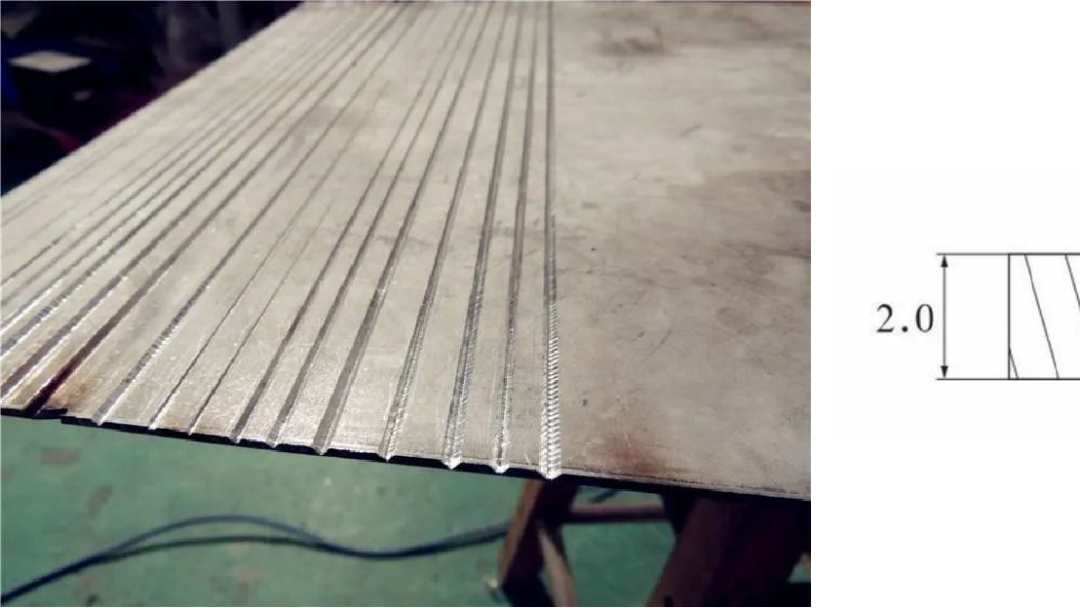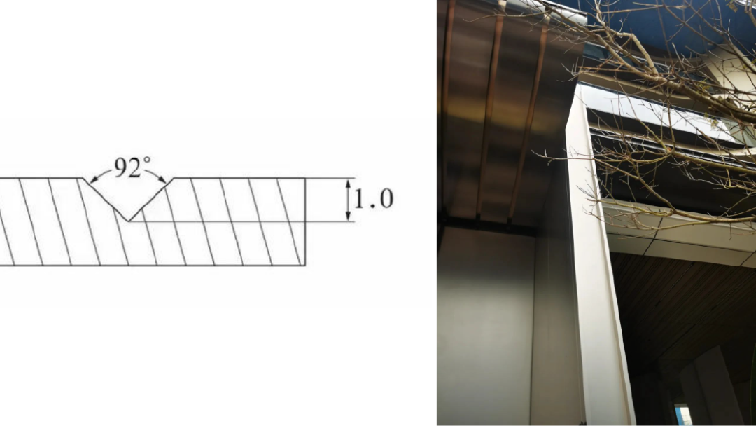 為實現(xiàn)陽角處堅挺效果,在不銹鋼背側(cè)提前刨槽僅留0.3mm(刨槽最少預(yù)留極限),并將開槽角度增大1-2°,這樣就能很好的避免折彎回彈造成的角度誤差,實現(xiàn)方正、挺拔的效果。