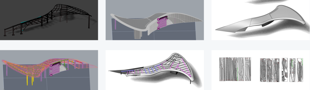由于門房面板面積超大且為雙曲面造型(長約45m,寬約20m),若制作鋼管骨架,鋼管造型制作還原度低且進度慢,材料浪費很大。故采用3D排版,將鋼板切割為副鋼架,對應(yīng)卡扣進行焊接,形成整體鋼架網(wǎng)片避免形變。雖然材料也有一定的浪費,但還原度較高。