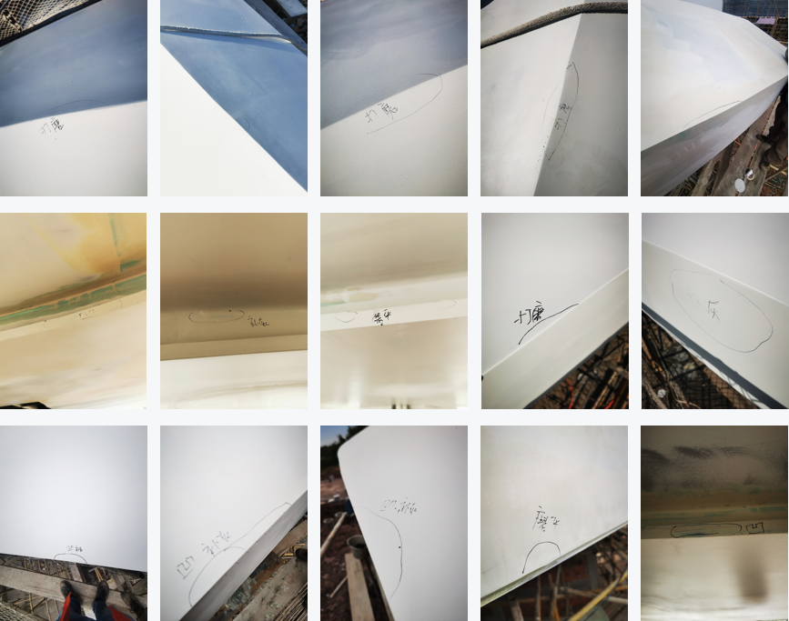 表面采用銀白色氟碳漆熱噴涂工藝,大面積油漆噴涂最難的就是控制色差。首先在油漆的選型上反復(fù)折騰,進行了多輪打樣,底漆+中漆+面漆,深入研究油漆工藝,保證油漆具備啞光效果同時兼顧金屬質(zhì)感。其次在色差控制上下功夫,對影響色差各項因素如:底材的平整度、油漆的稀釋度、噴涂的方向、油漆的批次、措施的選擇、批次的不同、噴涂的時長等等,著重將以上色差產(chǎn)生因素作為控制要點,嚴格按照油漆工藝規(guī)程進行表面涂裝,嚴格控制產(chǎn)品質(zhì)量。