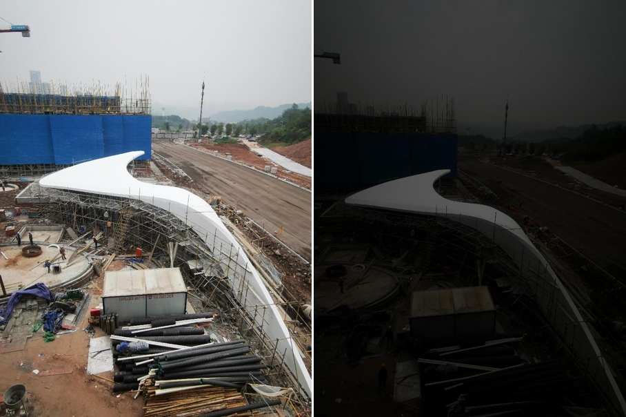 為表達靈動輕薄的感覺,萬華放棄傳統(tǒng)鋼板,選用3mm厚不銹鋼作為面層材料,并將整體通過建模、預(yù)制、焊接、刮灰、噴涂等多道工序?qū)⒉讳P鋼拼裝成一個整體,鳥瞰視角是大地女神的頭巾,正面視角則是一塊從土地中溫柔生長出的妙曼飄帶,將重巒疊嶂的重慶抽象化呈現(xiàn)。