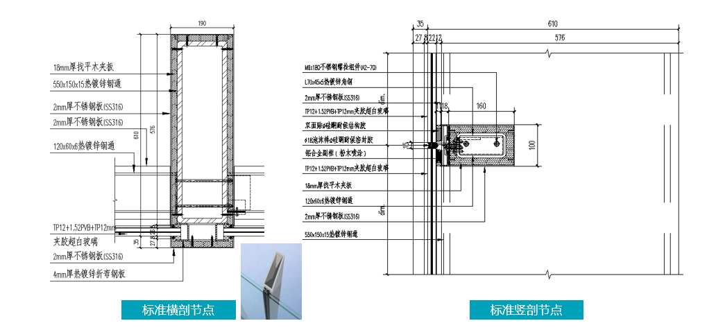 系統(tǒng)位于塔樓大堂位置,采用豎明橫隱玻璃幕墻,豎橫龍骨均采用熱鍍鋅鋼通,外包2.0mm厚不銹鋼板。玻璃幕墻高度為18m,采用鋁包鋼結(jié)構(gòu)系統(tǒng)保證大堂通高玻璃幕墻結(jié)構(gòu)受力安全。
