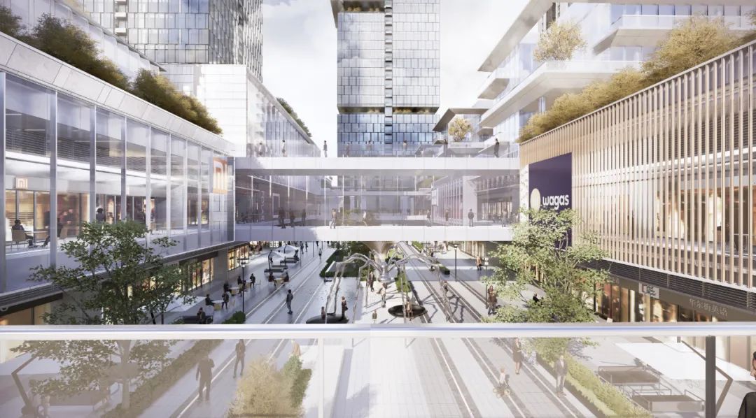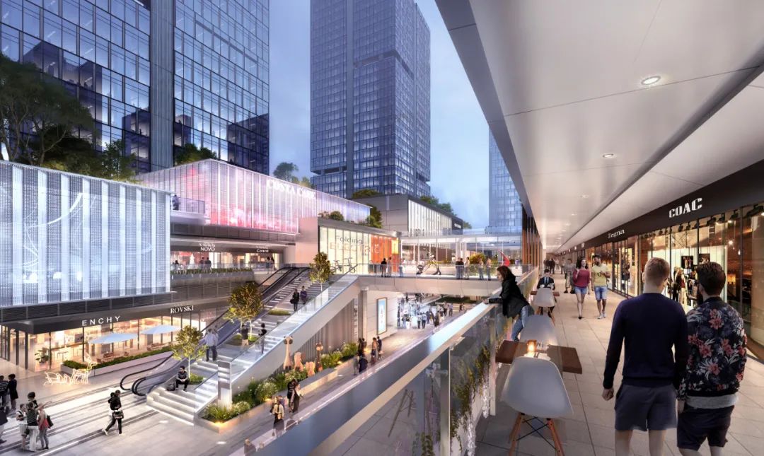 設(shè)計師摒棄傳統(tǒng)分棟式規(guī)劃格局,打造“三軸一心四組團”布局,合理分區(qū)、控制比例,讓密集型的交流成為可能。塔樓貼邊布置,中部營造更多公共空間;商業(yè)街區(qū)利用地形高差,打造雙層活力立體生活街區(qū),在區(qū)位上串聯(lián)辦公、公寓兩大組團,讓工作與生活場景實現(xiàn)相遇與串聯(lián);園區(qū)二層設(shè)置架空跑道,將兩區(qū)連為一體,讓使用者有更多的機會相遇,激活社區(qū)活力。