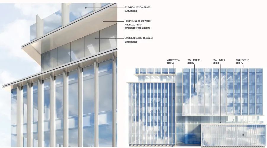 在塔樓部分,我們的解決方法是:借助豎向鋁板裝飾條,有助于人們提高對(duì)于建筑體量的感知。借助凹槽可視玻璃、標(biāo)準(zhǔn)可視玻璃、橫向鋁板裝飾條之間的相互配合,使得這些盒子看起來就像圍繞著一個(gè)非銜接的透明墻體。外立面被組織成各種細(xì)長(zhǎng)的、有框架的、直線型的 "盒子",而這些盒子與建筑設(shè)計(jì)所提出的“多寶格”的靈感相對(duì)應(yīng)。