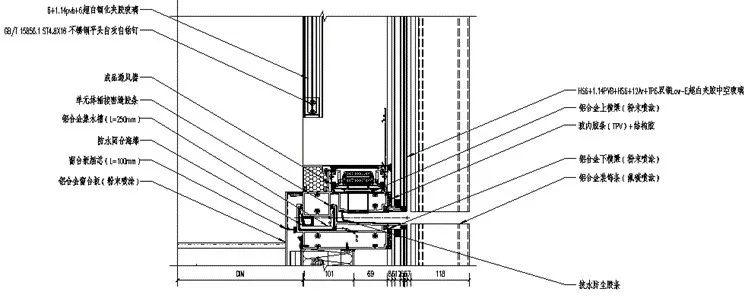 塔樓整體采用豎明橫隱系統(tǒng),將公母料上的隔熱條與膠條與玻璃在同一平面上,大大提高了熱工性能。巖棉延伸至鋁板側(cè),減少了室內(nèi)鋁板的空鼓感。大扣蓋采用間斷的連接件與立柱連接,提高了立柱鼻子的穩(wěn)定性。玻璃外片采用半鋼化的夾膠玻璃,提升了玻璃的安全性。