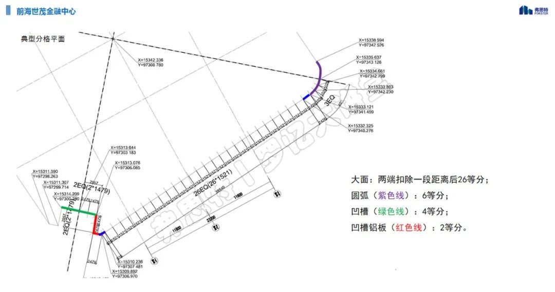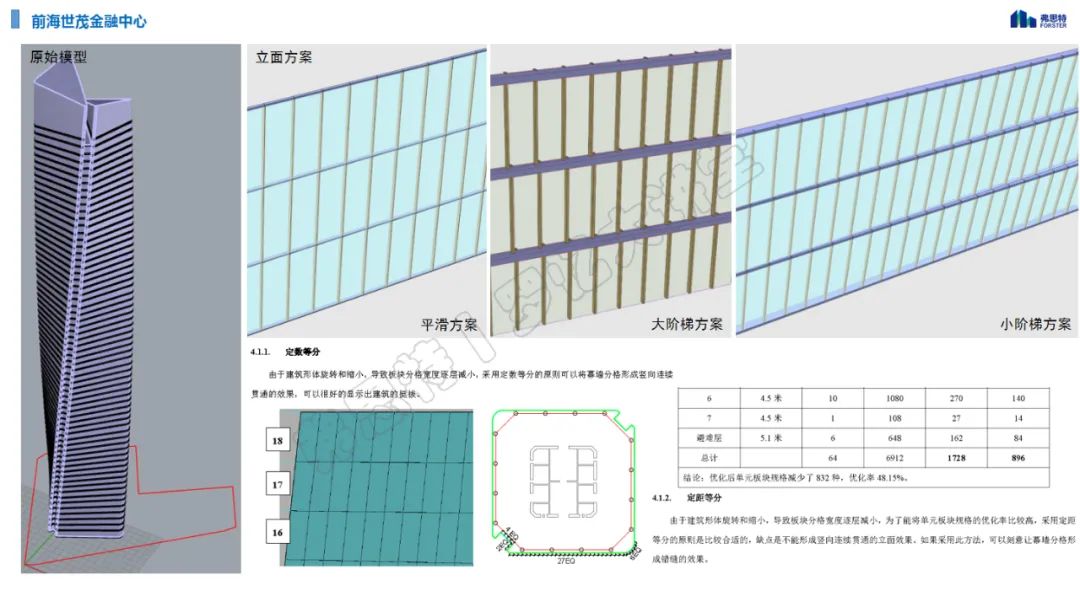 在設(shè)計(jì)過程中,建筑師想要實(shí)現(xiàn)平順、光滑的表皮效果,因此項(xiàng)目團(tuán)隊(duì)研究了定數(shù)等分、定距等分的立面分格,出具相關(guān)報(bào)告。另外,通過研究項(xiàng)目的表皮輪廓,即要實(shí)現(xiàn)每層旋轉(zhuǎn)約0.6136度,總共扭轉(zhuǎn)45度,高度上每一米的旋轉(zhuǎn)角度相等,圓弧部位通過比選,采用折線擬合的方案,綜上考慮完成后,最終確定了分格劃分原則,如下圖:
