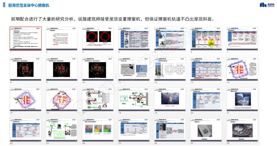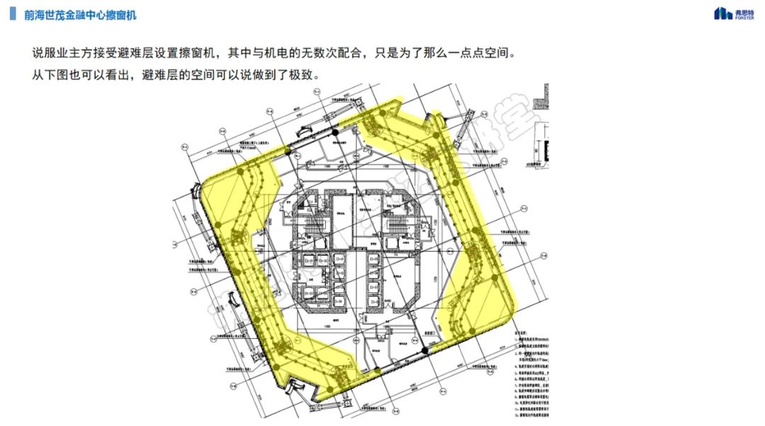 前期配合進(jìn)行了大量的研究分析,說服建筑師接受屋頂設(shè)置擦窗機(jī),但保證擦窗機(jī)軌道不凸出屋頂斜面。后續(xù)說服業(yè)主方接受避難層設(shè)置擦窗機(jī),其中與機(jī)電的無數(shù)次配合,從下圖也可以看出,避難層的空間幾乎做到了極致。