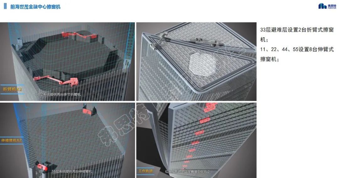 在項(xiàng)目33層避難層設(shè)置有2臺(tái)折臂式擦窗機(jī),11、22、44、55設(shè)置8臺(tái)伸臂式擦窗機(jī),屋頂設(shè)置2臺(tái)斜爬軌道式擦窗機(jī),且由原銜接軌道調(diào)整為貫通軌道,大大提高了安全性,最終將相關(guān)問題全部解決。