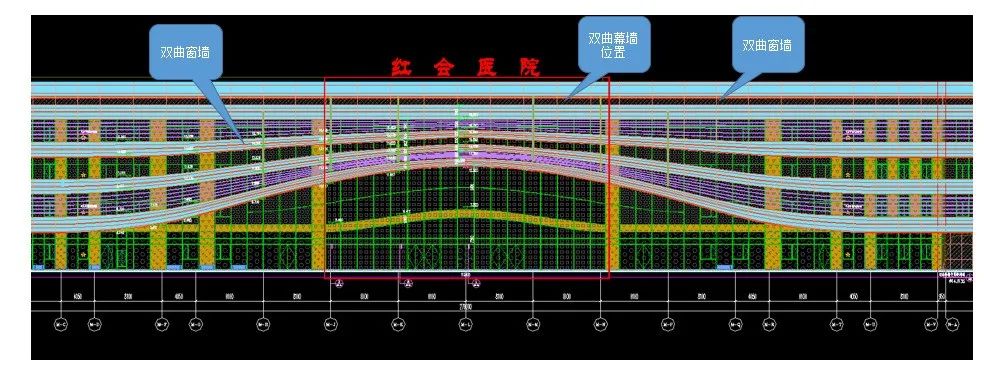 此位置是不規(guī)則雙曲,而窗墻系統(tǒng)無法實(shí)現(xiàn)此雙曲,如果按幕墻考慮,則需要考慮住建部38號文件的要求,所以此位置需用窗墻來實(shí)現(xiàn)。