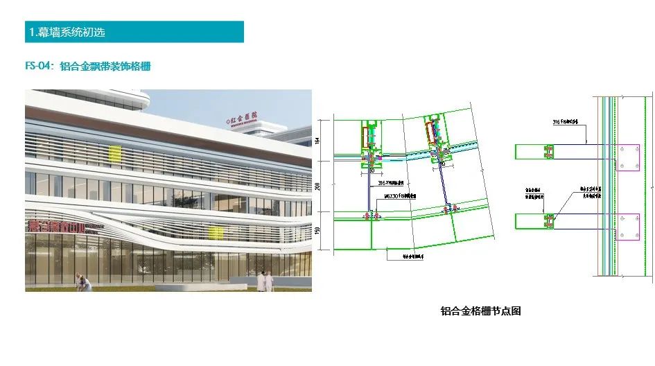 格柵部分采用鋁合金方管格柵,采用扣蓋形式,避免螺釘外漏。在救援窗位置設(shè)置為可開啟。 采用316不銹鋼挑件與窗墻龍骨相連,鋁型材表面處理為氟碳噴涂。
