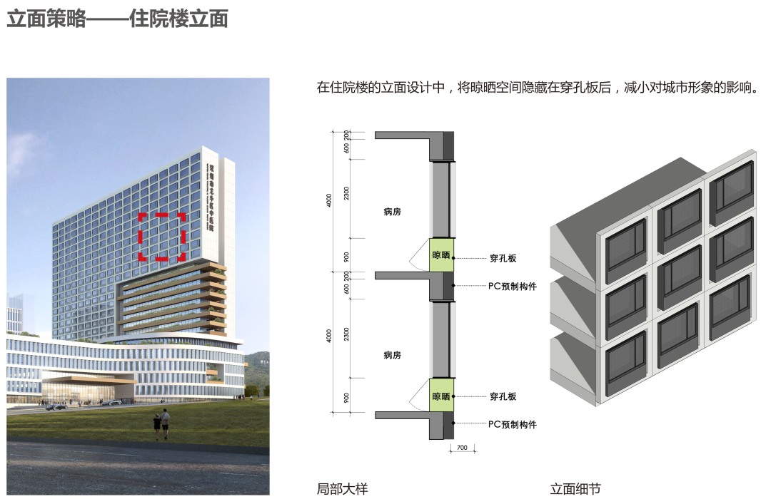 在住院樓的立面設(shè)計(jì)中,將晾曬空間隱藏在穿孔板后,減小對(duì)城市形象的影響。