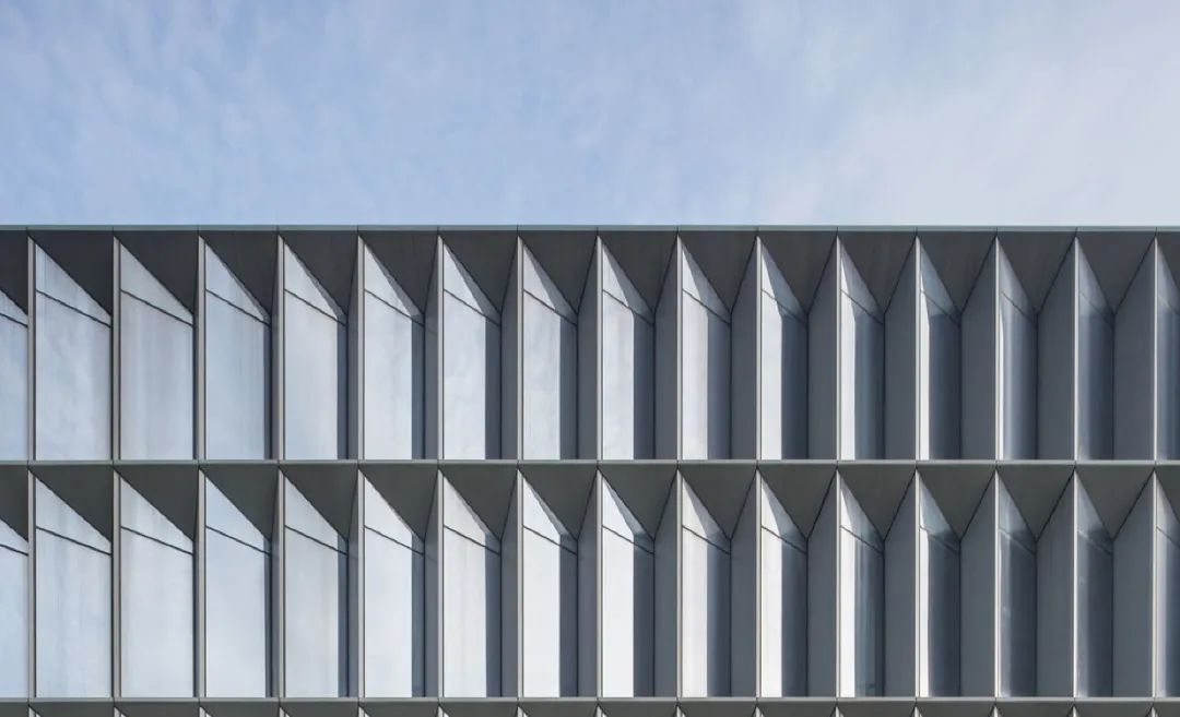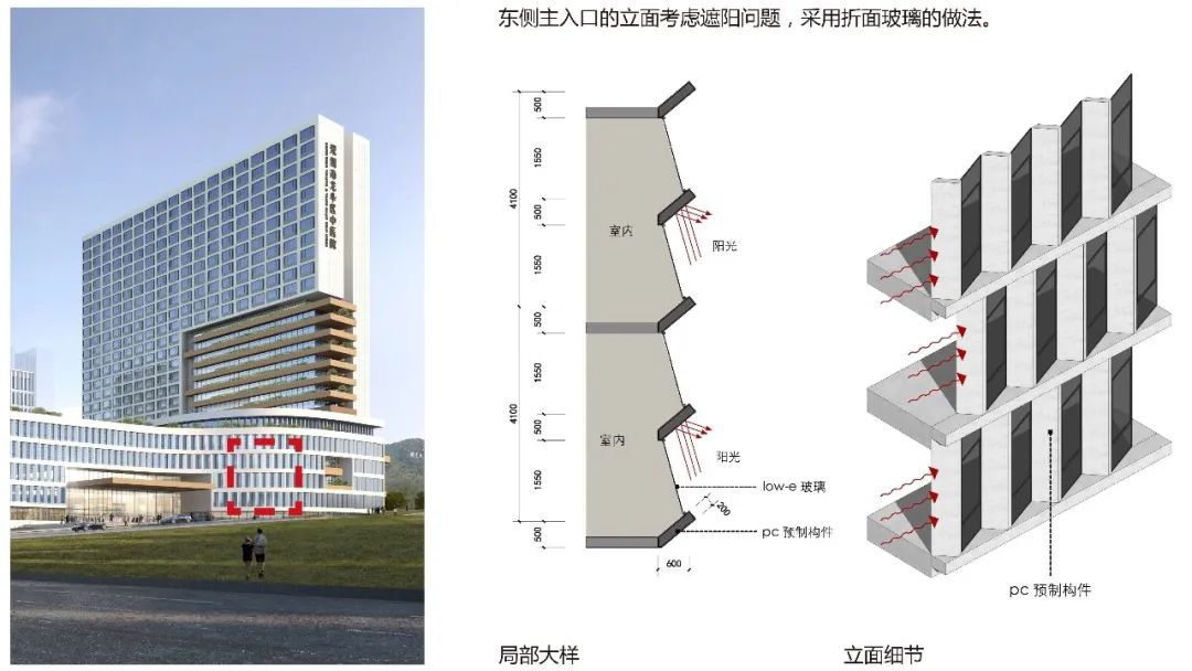 優(yōu)秀的建筑遮陽(yáng)設(shè)計(jì)能夠取得降低建筑的節(jié)能成效,還能夠?yàn)榻ㄖ⒚鎺?lái)更加有創(chuàng)意和豐富的藝術(shù)特效。龍華區(qū)中醫(yī)院東側(cè)主入口采用折線玻璃的做法,不僅能夠有效解決遮陽(yáng)問(wèn)題,在立面形式上顯得更加典雅挺拔;沿東側(cè)為橫向線條和隱框幕墻的肌理組合,簡(jiǎn)約舒展,共同形成了豐富的建筑立面形態(tài)。