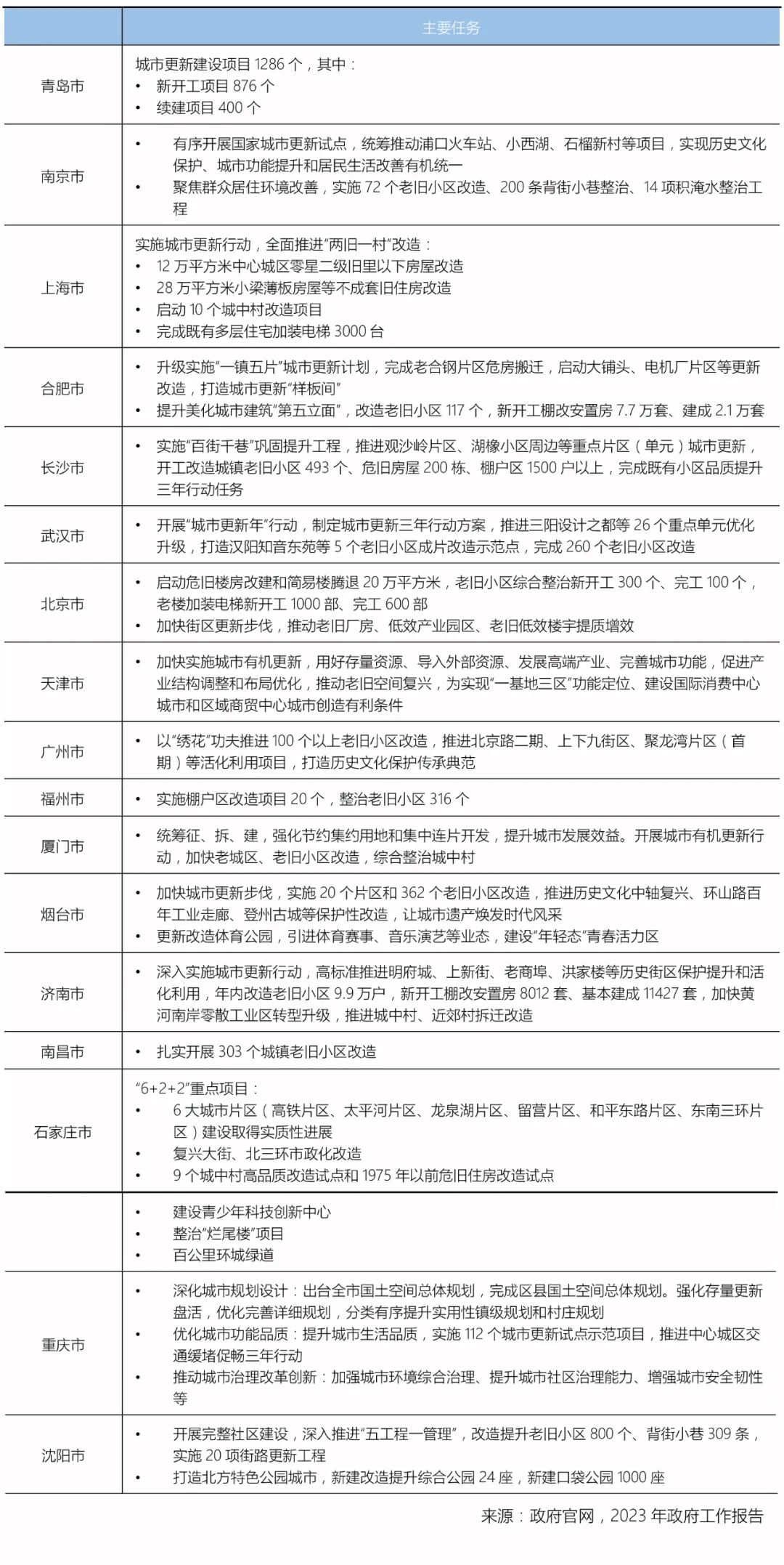 城市更新的目的是對城市中某一衰落的區(qū)域進行拆遷、改造、投資和建設,以全新的城市功能替換功能性衰敗的物質(zhì)空間,使之重新發(fā)展和繁榮。2023年1月,全國各城市政府工作報告陸續(xù)發(fā)布,《報告》全面回顧總結2022年主要工作,并對2023年重點工作進行了部署。城市更新作為城市保持生命力、增強整體機能的重要調(diào)節(jié)機制,各地方政府發(fā)布的《報告》中均明確了2023年發(fā)展目標: