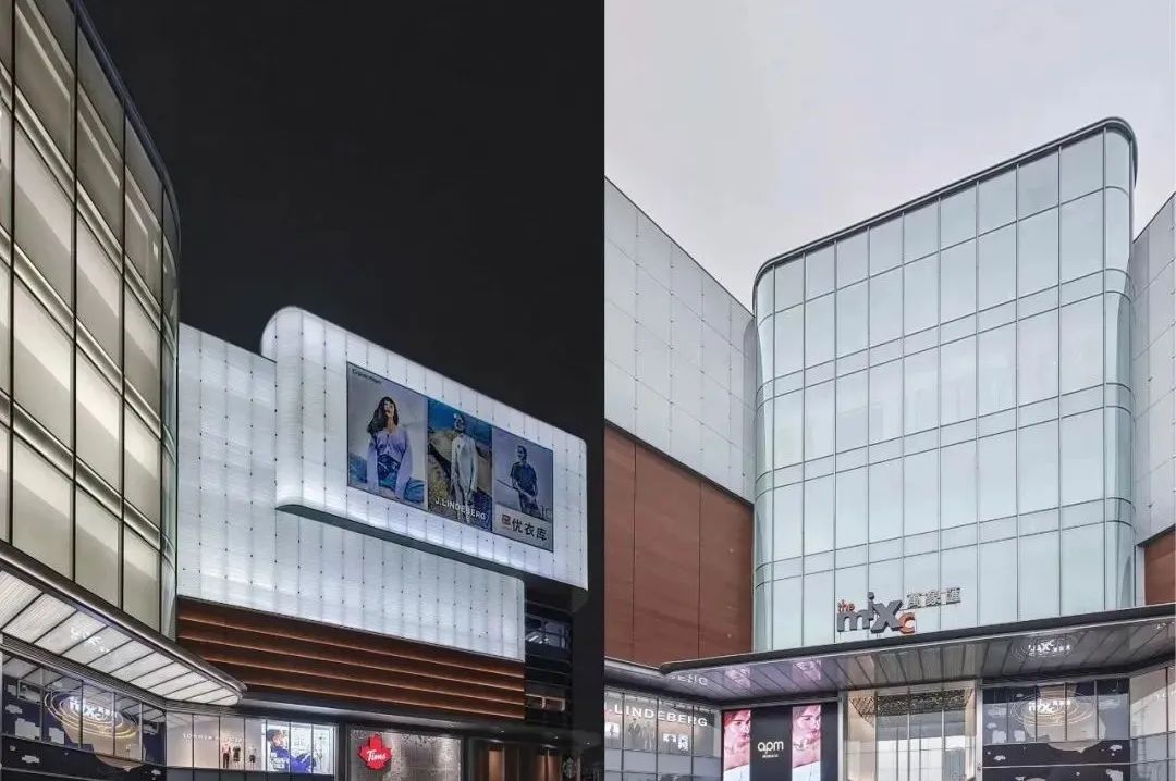 杭州華潤萬象城項目經(jīng)歷10多年,外立面老舊,無法滿足外立面設計潮流,增加立面展示效果實施了改造。新的項目方案在內(nèi)透和夜景的提升上做了很大的改變,玻璃幕墻設計采用櫥窗設計構造,玻璃采用夾層長虹玻璃+玻璃彩釉,玻璃結構受力形式采用上下邊簡支形式不設置玻璃肋,內(nèi)部墻面設置鋁板背板用于內(nèi)部墻面照明受光,內(nèi)部設置檢修馬道。首層采用高度9m夾層長虹玻璃+玻璃彩釉。豎向邊固定結合原有櫥窗邊龍骨玻璃吊掛,四邊受力設置。在里面上實現(xiàn)高度無龍骨遮擋。杭州華潤萬象城以“微更新”模式探尋一條商業(yè)街區(qū)改造、風貌保護和有機更新相結合的新路徑。打造集生活服務、購物休閑、配套居住于一體的購物中心。
