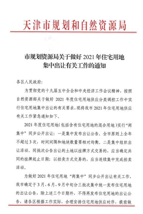 近期多家媒體報(bào)道,國家自然資源部發(fā)布住宅用地分類調(diào)控文件,2021年,包括北上廣深 4個(gè)一線城市,和南京、蘇州、杭州、廈門、福州、重慶、成都、武漢、鄭州、青島、濟(jì)南、合肥、長沙、沈陽、寧波、長春、天津、無錫18個(gè)二線城市,實(shí)行住宅用地兩集中:集中發(fā)布出讓公告和集中組織土地出讓,上述城市住宅用地公告不能超過3次。沒有統(tǒng)一的時(shí)間,例如天津是3、6、9三個(gè)月,濟(jì)南是5、8、10三個(gè)月。