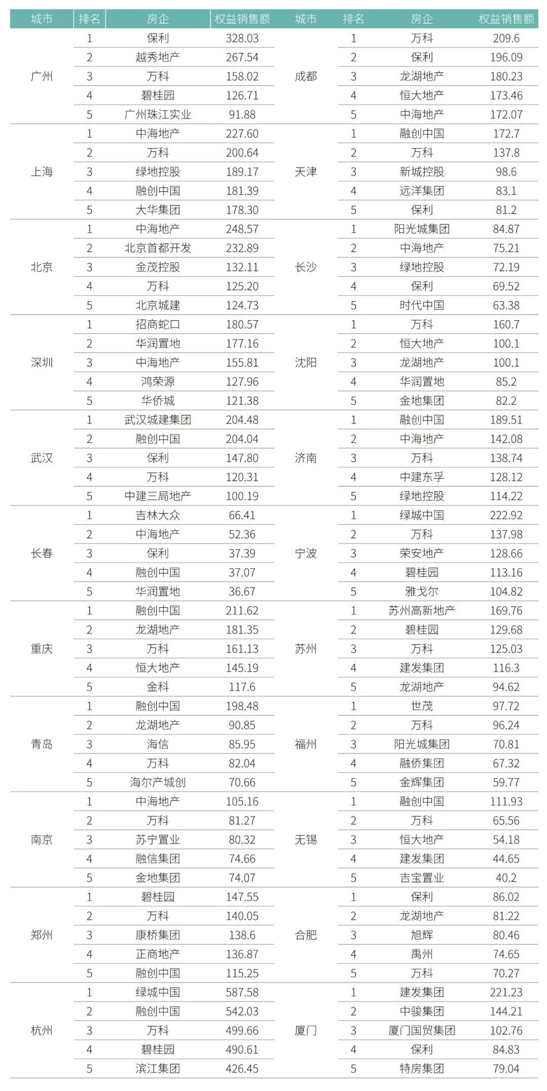 22城在2020年TOP5房企的權(quán)益銷售額數(shù)據(jù)