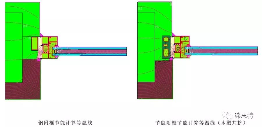 如上圖等溫線分布,節(jié)能附框相較于鋼附框,傳熱系數(shù)較低,可避免安裝位置形成冷橋。節(jié)能附框尺寸較多,滿足各種型材系列的需求,且鋼為不可再生資源。故而,從環(huán)保、節(jié)能、應(yīng)用及后期更換、維護(hù)的角度,節(jié)能附框有更多優(yōu)勢(shì)。