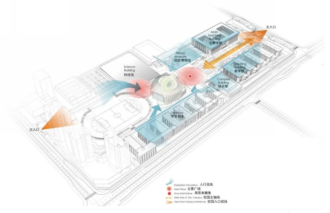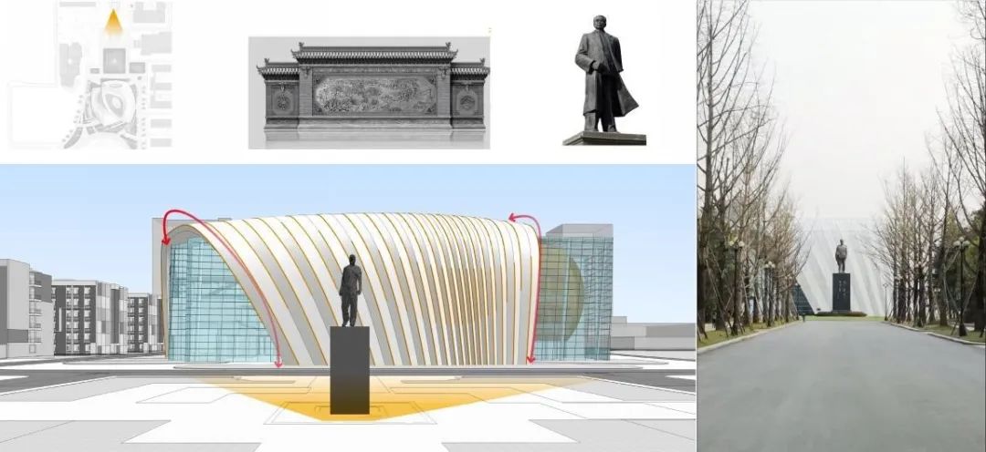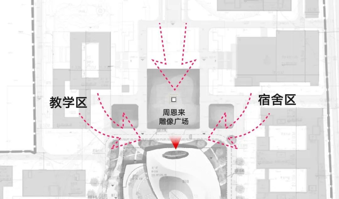 1、建筑北側(cè)作為校園軸線上周恩來(lái)雕像的背景,運(yùn)用中國(guó)古典建筑“影壁”的概念形成進(jìn)入圖書館的“過渡空間”;