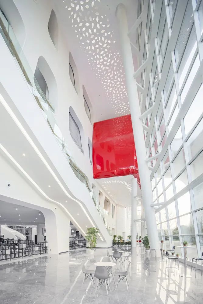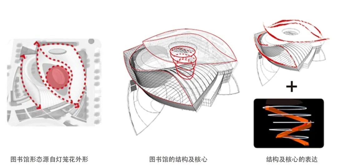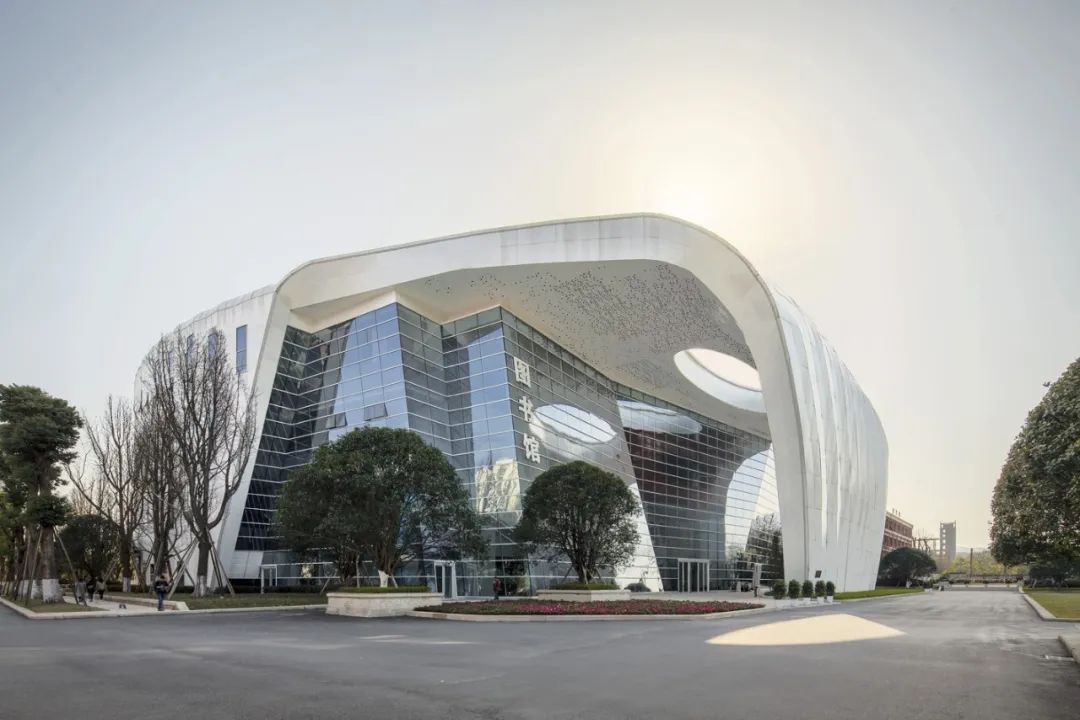 圖書館形態(tài)源自燈籠花優(yōu)雅的外形,北側(cè)和東側(cè)以實(shí)體墻面為主,宛若花朵枝葉包裹;西側(cè)和南側(cè)是如燈籠花瓣晶瑩剔透的玻璃幕墻。幾條流動(dòng)的曲面勾勒出花朵的動(dòng)感形態(tài),與其周圍教學(xué)樓、宿舍樓相映成趣,成為整個(gè)校園的地標(biāo)和視覺焦點(diǎn)。
