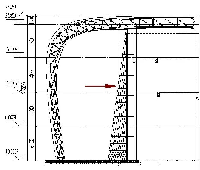 圖書館主入口的灰空間內(nèi)側(cè)的玻璃幕墻是本項(xiàng)目的主要立面,玻璃幕墻內(nèi)側(cè)為通高大堂,主體結(jié)構(gòu)梁高度上跨度約18米(3層),平面上為距離表皮約1.2m的鋼結(jié)構(gòu)柱,鋼結(jié)構(gòu)柱的水平距離為10.8米。建筑師PHA為了在入口大廳范圍營(yíng)造極致通透的效果,這部分不允許設(shè)置土建或者鋼結(jié)構(gòu)梁。而現(xiàn)場(chǎng)的主體結(jié)構(gòu):屋頂梁、以及入口部位的地面不允許我們采用拉索幕墻。怎么辦?