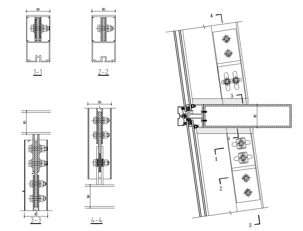 為了弱化影響,從鋼柱上外伸的牛腿,采用了梯形變截面龍骨,與橫向鋼管進(jìn)行等強(qiáng)焊接。為了確保橫梁的結(jié)構(gòu)可靠性,在鋼管龍骨接頭的部位,采用了L-950mm的芯套,通過螺栓組以及深插接的構(gòu)造設(shè)計(jì)來(lái)配合解決問題。最終,依靠這沿著高度方向3.6m一共五根橫向的鋼龍骨,我們一體解決了玻璃幕墻板塊的自重和風(fēng)荷載的問題。
