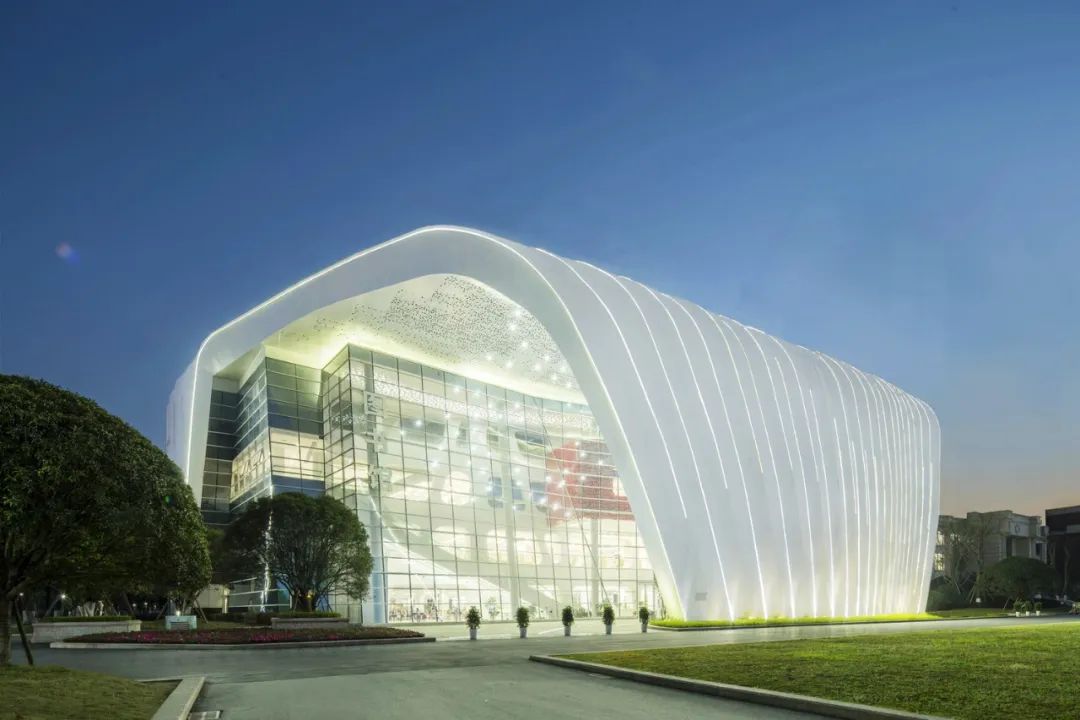 圖書館西側(cè)和南側(cè)是窗墻設(shè)計(jì),透出內(nèi)部燈光。流動(dòng)的曲面勾勒出動(dòng)感形態(tài),形成其周圍教學(xué)樓、宿舍樓的“核心”,成為整個(gè)校園的地標(biāo)和視覺焦點(diǎn)。北側(cè)圖書館主入口作為校園中軸線終點(diǎn)的背景,與校園肌理完美結(jié)合。