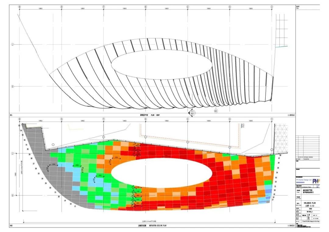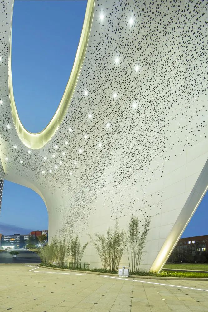 大屋蓋的內(nèi)部,建筑師采用“星空”的概念來(lái)隱喻莘莘學(xué)子探索未知世界,所有鋁板都是以2000mmx1200mm的長(zhǎng)寬尺寸作為標(biāo)準(zhǔn)件進(jìn)行拼接,其中包括四種圖案的穿孔鋁板與一種不開孔的實(shí)面鋁板,共五種圖案組成北側(cè)屋蓋內(nèi)表面的圖案。