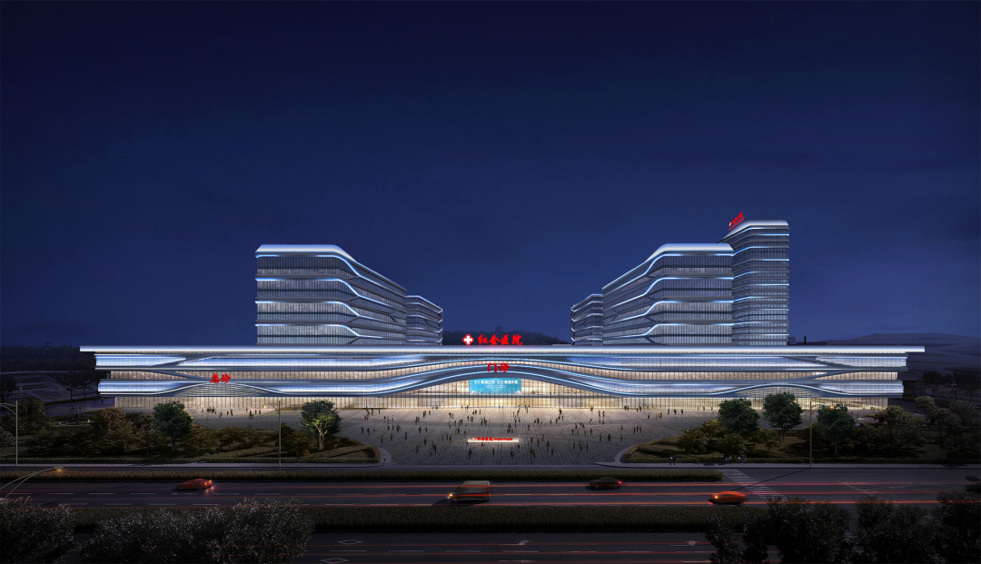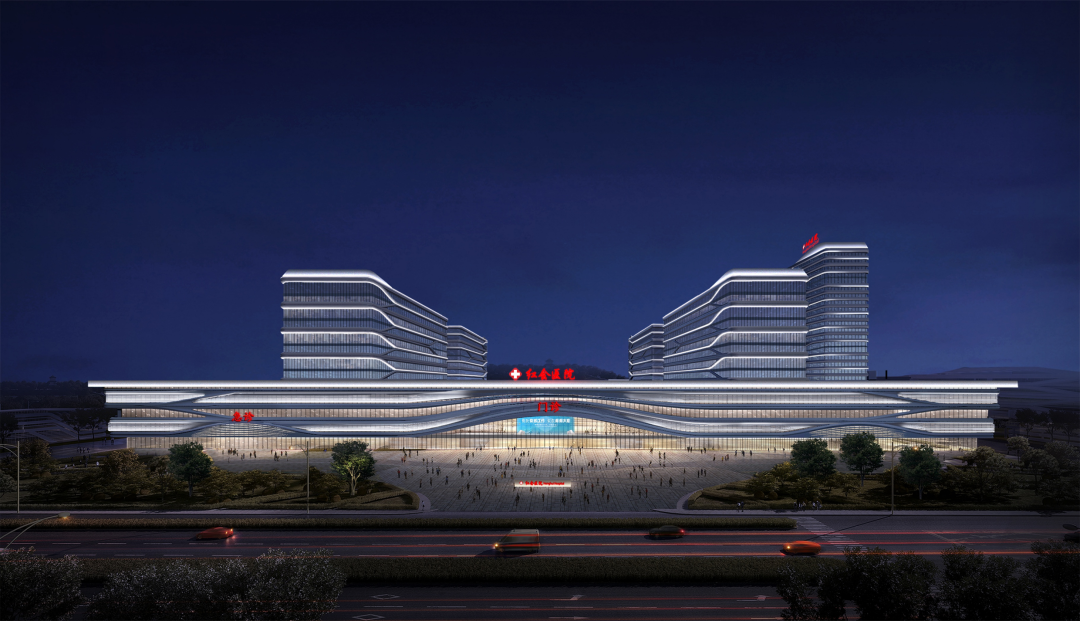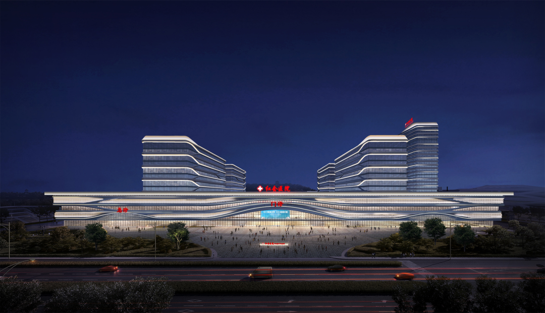 建筑主體以白色為基色調(diào),配合水平線條的舒緩隱喻,營造出靜謐治愈的醫(yī)療建筑特征。曲線的立面造型,在隱含“八水繞長安”的文化韻味的同時(shí),與周邊文景山公園的山盤水曲相得益彰,為病患、醫(yī)護(hù)人員創(chuàng)造了一個(gè)圓融恬適的醫(yī)療環(huán)境。照明設(shè)計(jì)與立面設(shè)計(jì)相融合,共同傳遞出人性與健康的療愈理念。