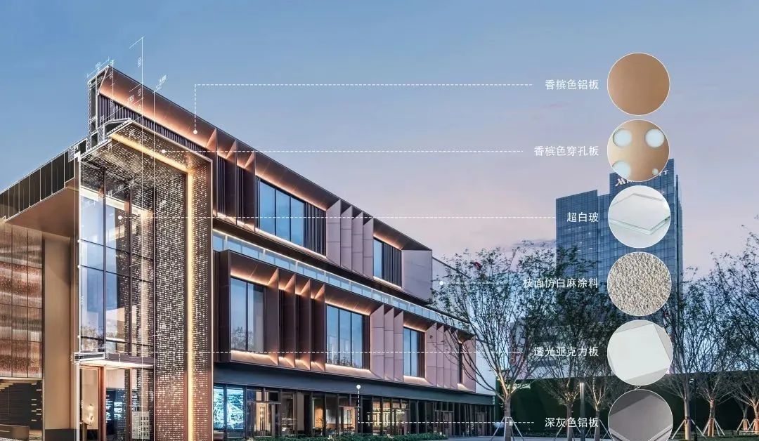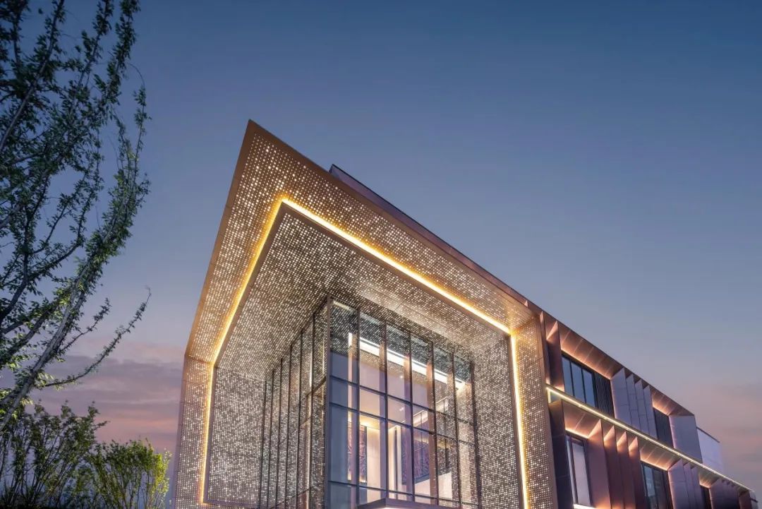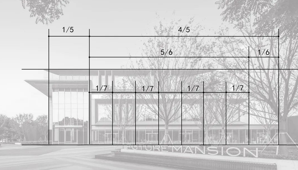 建筑強(qiáng)調(diào)一種透明與輕質(zhì)的特性,整體使用香檳金鋁板和玻璃幕墻,精準(zhǔn)地考量形體關(guān)系和比例,將整體體量以比例分割出虛實(shí)關(guān)系,展現(xiàn)重復(fù)序列的空間比例。