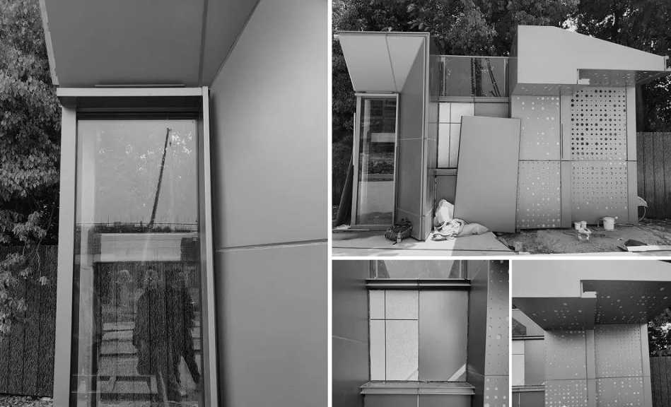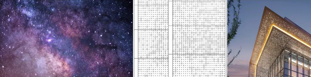 入口空間是連接內(nèi)外部空間的樞紐,也是立面構(gòu)造設(shè)計(jì)的開始或結(jié)束,往往一個(gè)優(yōu)秀的入口空間能決定整個(gè)建筑最直接的觀感。建筑主入口為燈光重點(diǎn)表現(xiàn)面,不斷模擬穿孔板的穿孔分布,打造漸變的肌理關(guān)系和璀璨的星河質(zhì)感。經(jīng)過現(xiàn)場反復(fù)調(diào)試打造出晶瑩閃爍的星光效果,與入口的景觀裝置結(jié)合,引人入勝,成為新的打卡圣地。