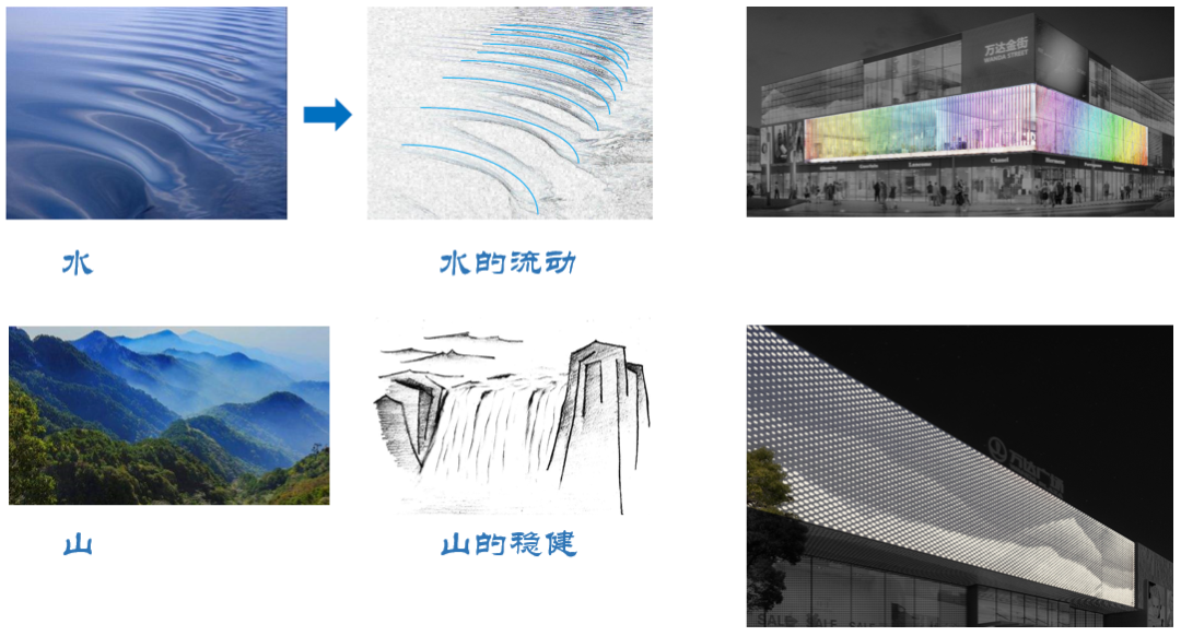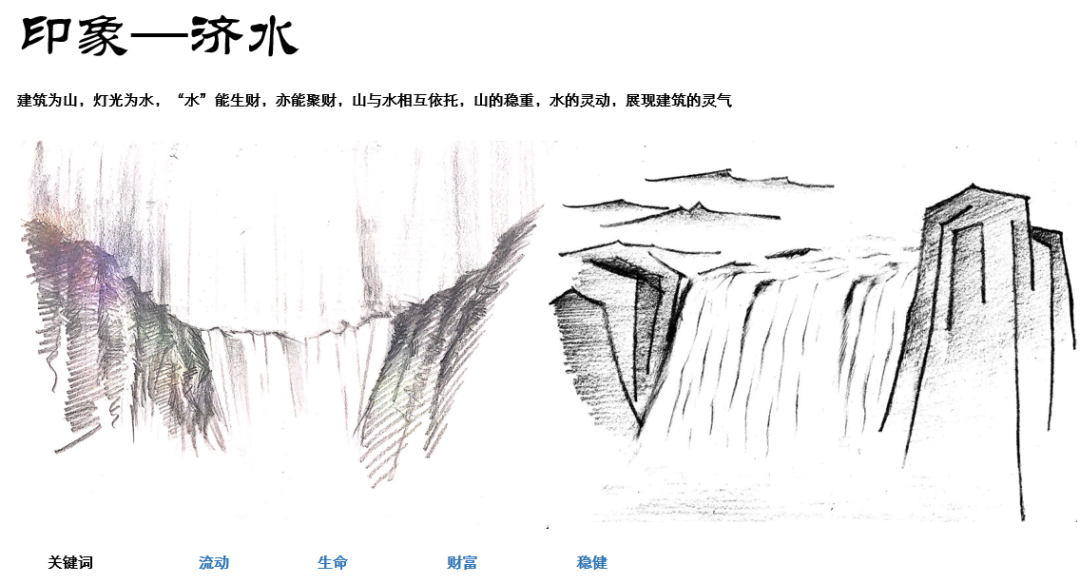 現(xiàn)代建筑的設(shè)計,不再追求單一的功能性、實用性,而是把自然和人文環(huán)境進行融合,因地制宜設(shè)計出具有特色文化氣息的建筑。本項目位于濟南市,結(jié)合當(dāng)?shù)靥厣宋臍庀?,在符合城市夜景燈光調(diào)性的基礎(chǔ)上,提出了“建筑為山,燈光為水”的設(shè)計理念,營造山水交錯的意境。