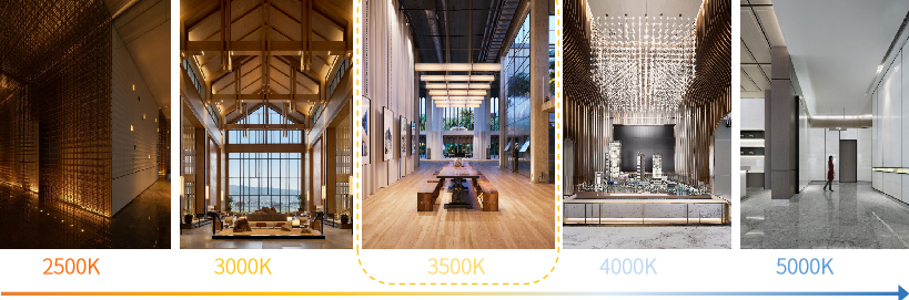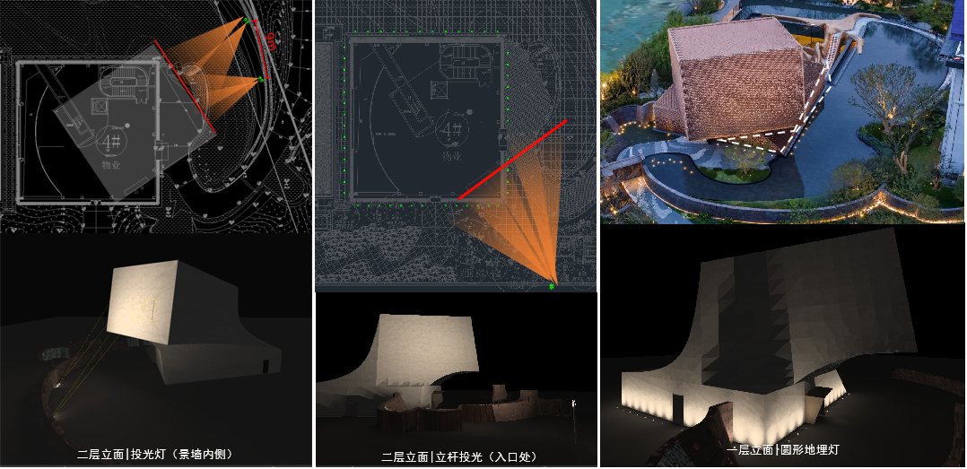 色溫規(guī)劃:建筑主要采用暖白色光(色溫范圍3500K),以體現(xiàn)建筑的典雅、沉穩(wěn)及輕奢品質(zhì);強(qiáng)調(diào)燈光的層次性,增強(qiáng)建筑結(jié)構(gòu)的表現(xiàn)力和整體空間的層次感。