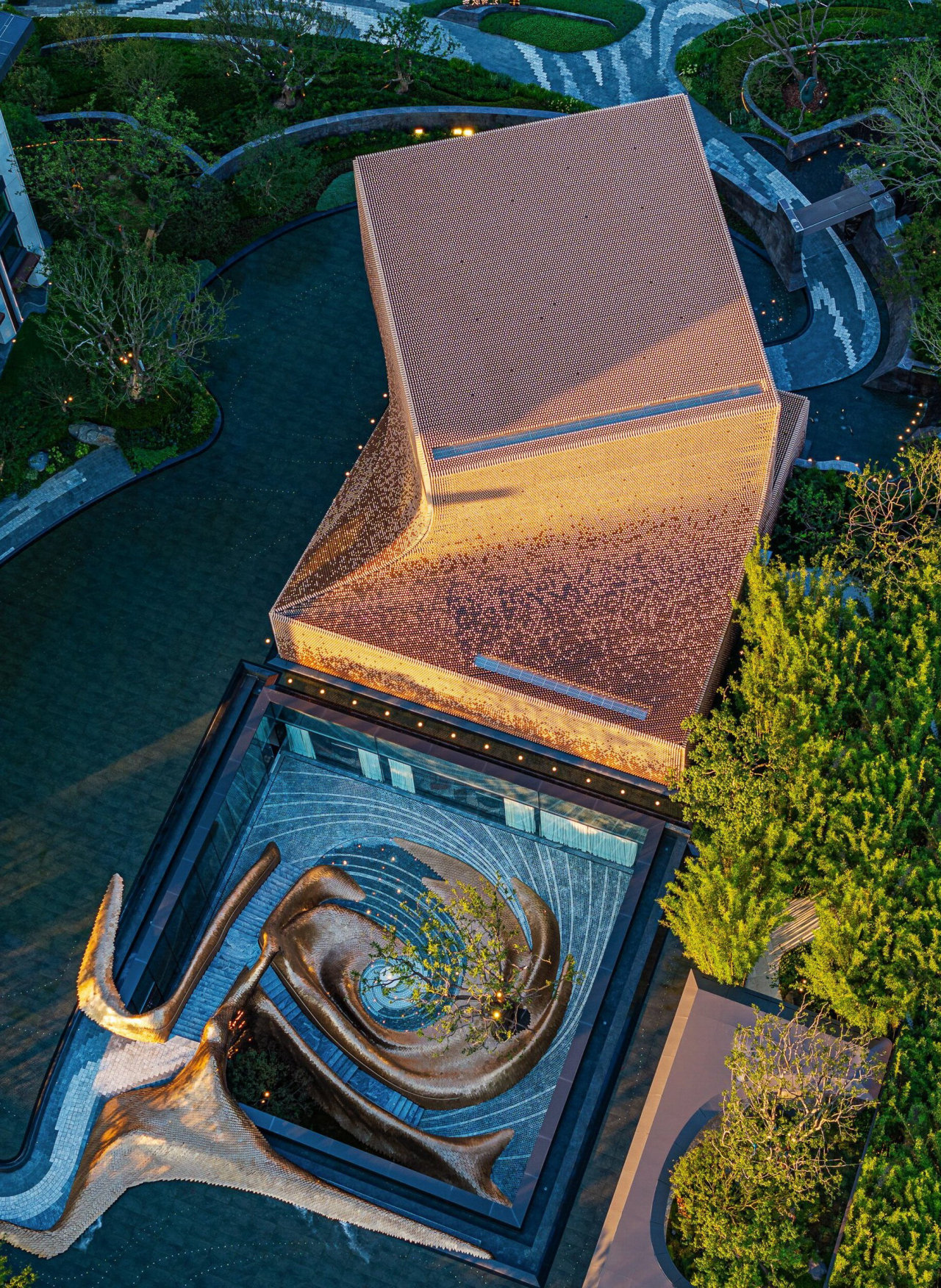下沉庭院設(shè)計(jì)取意《永樂大典·樂章》中的“簫韶九成 鳳凰來儀”,以及李白《登金陵鳳凰臺(tái)》的詩意景象,將傳統(tǒng)鳳凰圖騰轉(zhuǎn)化為動(dòng)態(tài)空間敘事,結(jié)合綠植營(yíng)造“鳳棲梧桐”的東方園林意境。