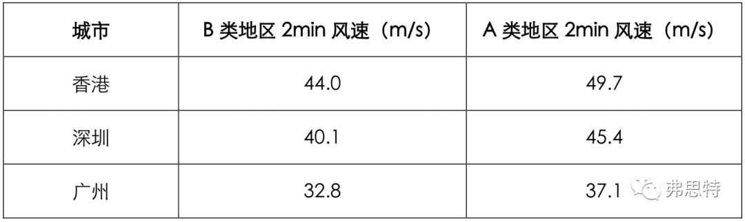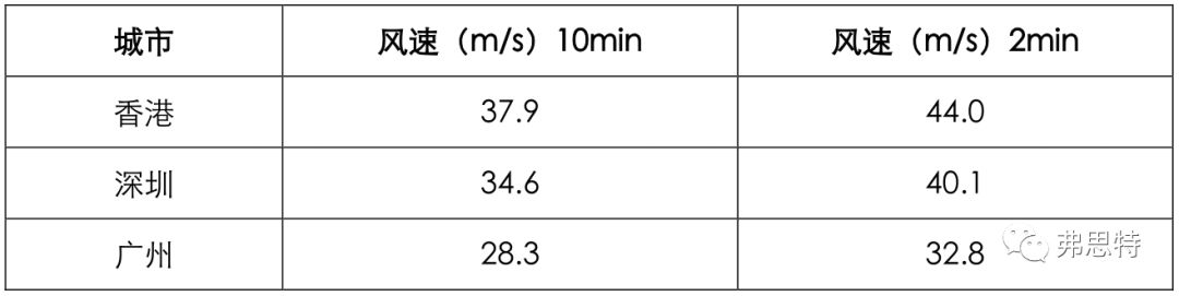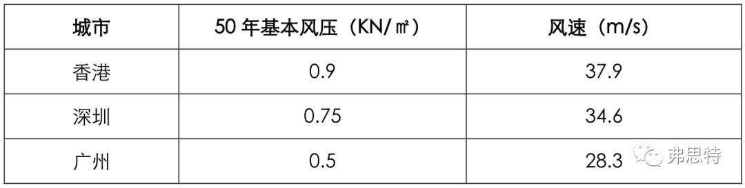 《建筑結(jié)構(gòu)荷載規(guī)范 GB 50009-2012》中關(guān)于基本風(fēng)壓的解釋為:風(fēng)荷載的基準(zhǔn)壓力,一般按當(dāng)?shù)乜諘缙教沟孛嫔?0m高度處10min平均的風(fēng)速觀測(cè)數(shù)據(jù),經(jīng)概率統(tǒng)計(jì)得出50年一遇最大值確定的風(fēng)速,再考慮相應(yīng)的空氣密度,按貝努利(Bernoulli)公式確定的風(fēng)壓。根據(jù)貝努利公式計(jì)算香港、深圳、廣州的基本風(fēng)壓對(duì)應(yīng)風(fēng)速如下: