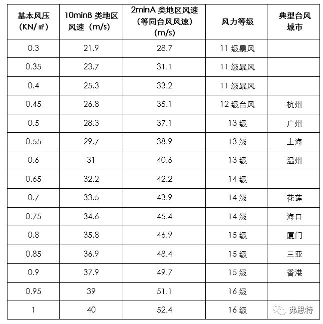 ◆ 各基本風(fēng)壓與可承受臺(tái)風(fēng)風(fēng)速對(duì)照表