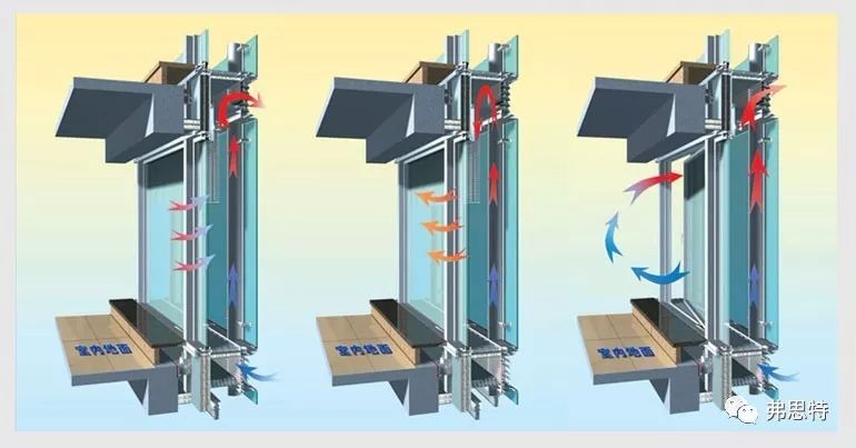 呼吸式幕墻由內(nèi)外兩層玻璃幕墻組成,與傳統(tǒng)幕墻相比,它的最大特點(diǎn)是由內(nèi)外兩層幕墻之間形成一個(gè)通風(fēng)換氣層,由于此換氣層中空氣的流通或循環(huán)的作用,使內(nèi)層幕墻的溫度接近室內(nèi)溫度,減小溫差因而它比傳統(tǒng)的幕墻采暖時(shí)節(jié)約能源42%-52%;制冷時(shí)節(jié)約能源38%-60%。另外由于雙層幕墻的使用,整個(gè)幕墻的隔音效果得到了很大的提高。呼吸式幕墻分為外循環(huán)式和內(nèi)循環(huán)式兩種,目前國(guó)內(nèi)應(yīng)用較多的是外循環(huán)式幕墻。