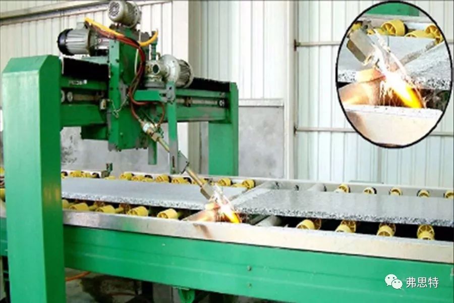 多功能異型機(圖14)可加工火燒面、荔枝面等,采用全自動啟動操作線,自動點火、自動橋擺、自動進板;加工的成品表面深淺一致、均勻、光滑無刺,手感較好,平面度控制在0.5mm 以內(nèi),絕非手工加工可比擬。
